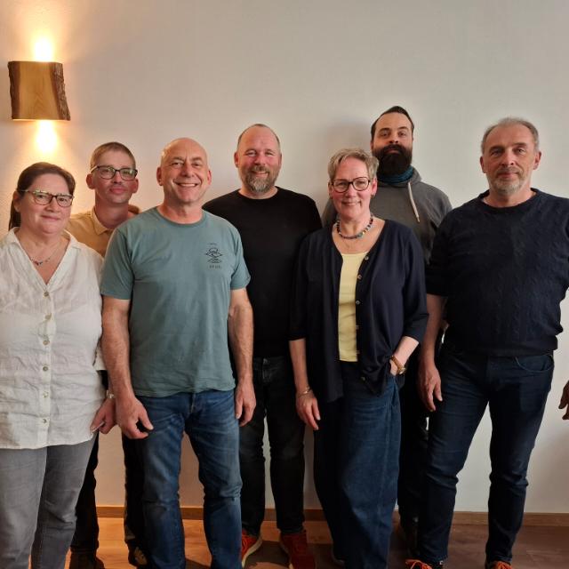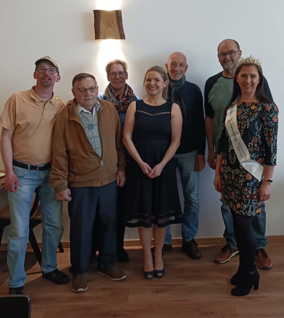 Von li nach re: Martina Griese, Schriftführerin und Öffentlichkeitsarbeit; Kristina Wulfert, Projektsprecherin Lehrbienenstand Dausenau und amtierende Bienenkönigin; Martin Hlauschek, Kassenwart; Stephanie Schmitz, Zeugwartin; Marion Vomberg, 1. Vorsitzende; Michael Ferdinand, 2. Vorsitzender; Rene Maarschalkerweerd, Beisitzer; Andreas Griese, Beisitzer. fehlen: Betina Aleithe, Projektsprecherin Bienengarten Kadenbach und Andre Tribull, Zuchtwart.
